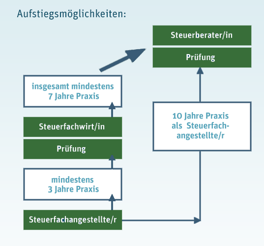 Angehende und fertige Steuerfachangestellte können sich über hervorragende Arbeitsmarktchancen in einem krisenfesten Berufsfeld freuen. Um den Überblick der sich ständig ändernden Steuergesetze nicht zu verlieren, ist kontinuierliche Fortbildung unerlässlich. Nach 10-jähriger Berufserfahrung steht auch Steuerfachangestellten ohne Studium eine Tätigkeit als Steuerberater offen. Ebenso bietet der Beruf des Steuerfachgestellten die perfekte Basis für eine fachspezifische Weiterbildung – z. B. zum Steuerfachwirt oder zum Bilanzbuchhalter.