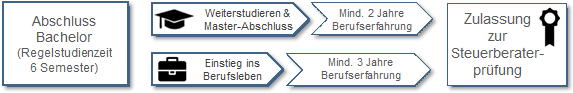 „Zur Steuerberaterprüfung ist zuzulassen, wer ein wirtschaftswissenschaftliches oder rechtswissenschaftliches Hochschulstudium oder ein Hochschulstudium mit wirtschaftswissenschaftlicher Fachrichtung erfolgreich absolviert hat und eine anschließende praktische Tätigkeitszeit von zwei bzw. drei Jahren nachweisen kann.“