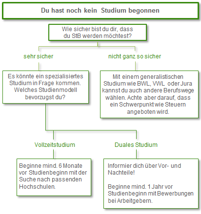 Fakt ist: Die Studienwahl kann man nicht innerhalb von ein paar Stunden abhaken. Beschäftigen Sie sich intensiv mit den möglichen Studienwegen, Studiengängen sowie den passenden Universitäten und Fachhochschulen. Je besser Sie informiert sind, desto größer die Wahrscheinlichkeit, dass Sie ein Steuerberater Studium finden, das auch wirklich zu Ihnen passt.