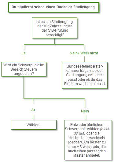Wenn sich erst mitten in einem Studium der Berufswunsch Steuerberater entwickelt, gibt es verschiedene Möglichkeiten, sich im Studienverlauf bzw. danach entsprechend auszurichten. Allerdings müssen Sie dafür eventuell flexibel bei der Wahl der Hochschule sein. Sind Sie sicher, dass Ihr Studiengang zur Teilnahme am Steuerberaterprüfung berechtigt und wird ein Schwerpunkt im Bereich Steuern angeboten, wählen Sie diesen. Falls nicht, sollten Sie sich bei der Bundessteuerberaterkammer erkundigen, ob Ihr Studiengang zur Zulassung für die Steuerberaterprüfung berechtigt. Gegebenenfalls wird ein Wechsel an eine andere Hochschule nötig sein.